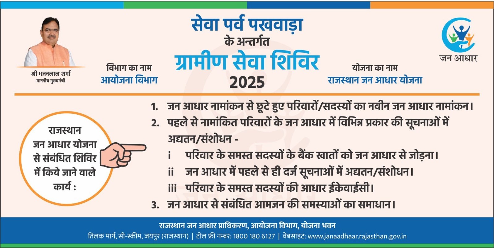ग्रामीण/ शहरी सेवा शिविर में राजस्थान जन आधार योजना से सम्बंधित कार्य किये जायेंगे।